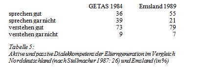 Wenn also 95% der Kinder im Jahre 1984 ausschließlich Hochdeutsch im Elternhaus erlernen, fällt das Plattdeutsche als Muttersprache weitgehend aus (zumindest in dem Sinne: von der Mutter als Erstsprache erlernt). Nun kommt noch hinzu, daß die Großfamilie früherer Prägung nicht mehr existiert, so daß die Vermittlung des Plattdeutschen durch den täglichen Umgang mit den Großeltern auch in den meisten Fällen nicht mehr stattfindet. Wenn jedoch das Plattdeutsche nicht in den Kinderjahren vermittelt wird, so sind nach hiesigen Erfahrungen — die zumindest für das Emsland gelten — die Chancen für den späteren Erwerb aktiver Kenntnisse denkbar schlecht.