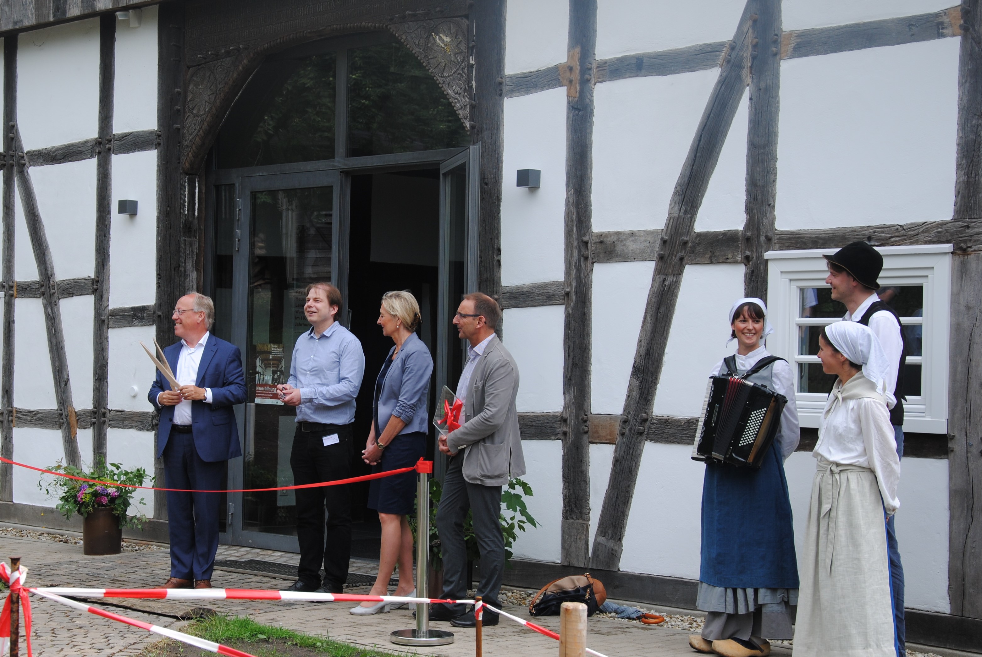 Ein besonderes Highlight bei der Eröffnung des Doppelheuerhauses Olderdissen im Juni 2018 war die Theater – und Musikgruppe Klio & Konsorten (rechts im Bild)