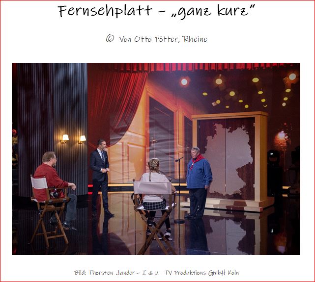 Vör dat Studio kam noch gau ne Frau mit nen Puderquast und widdelde mi üm de Niäs herüm. Dann göng ne graute Porte up un ick moss rin. Riene ne va plus … Glieks nammen mi veer Kameras int Visier. Un von ächten weg kreeg ick so iäben noch to hören: „Bitte ganz kurz.“
